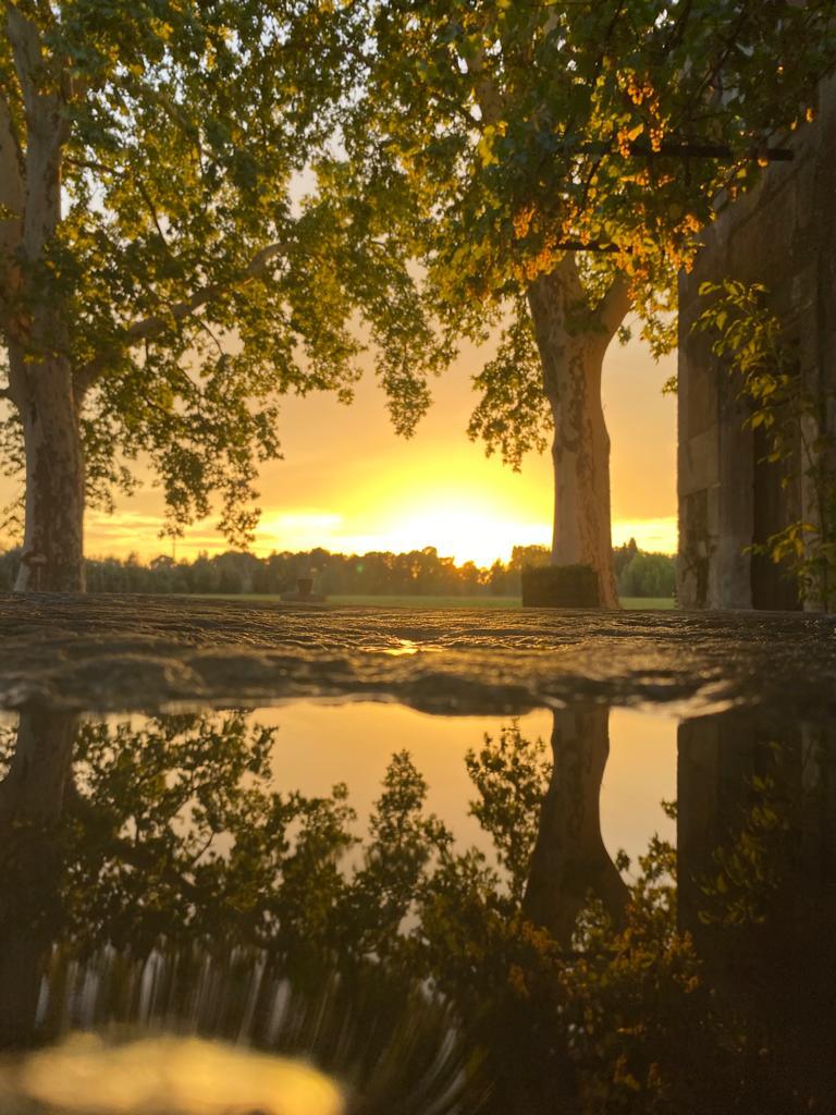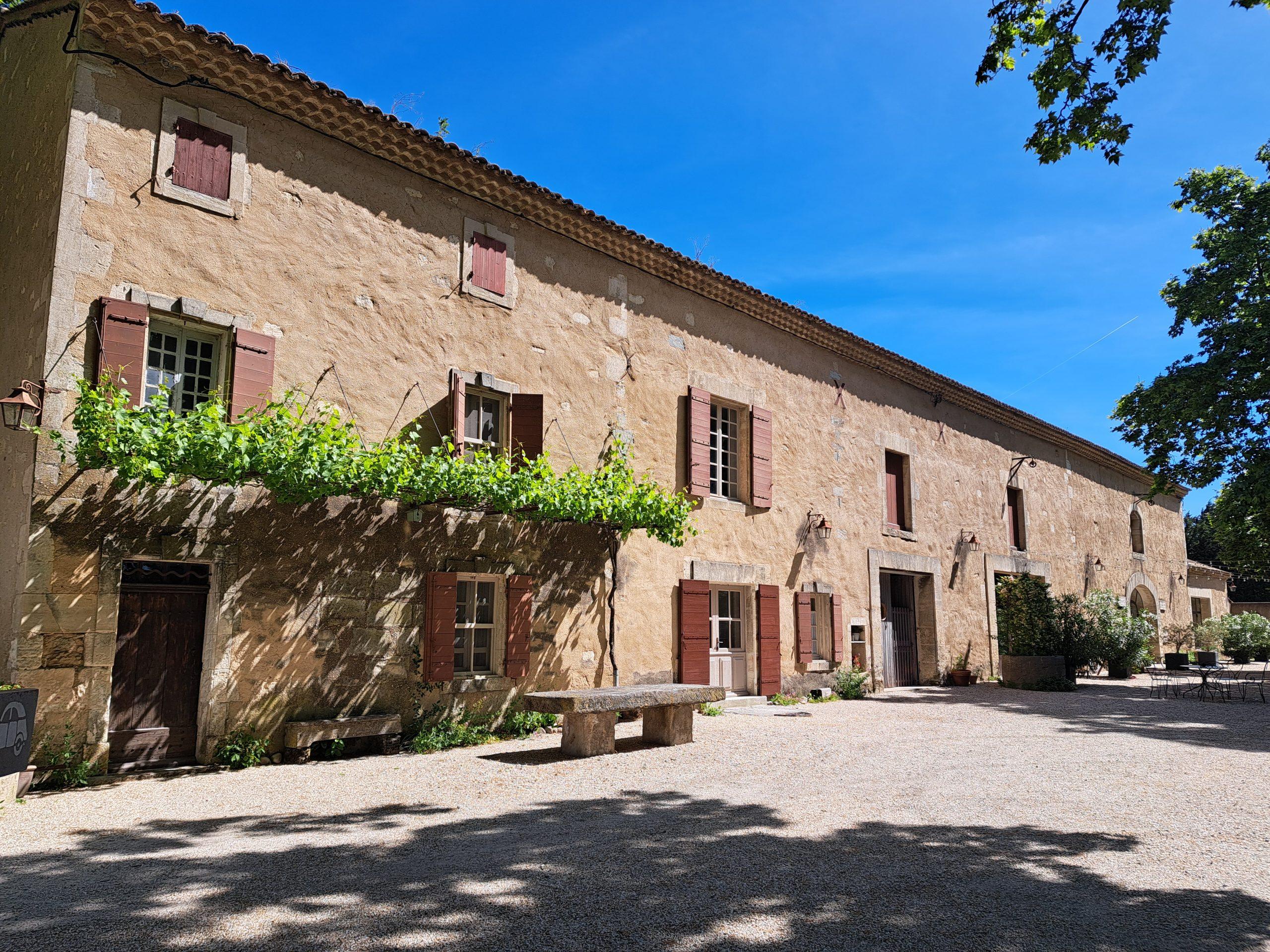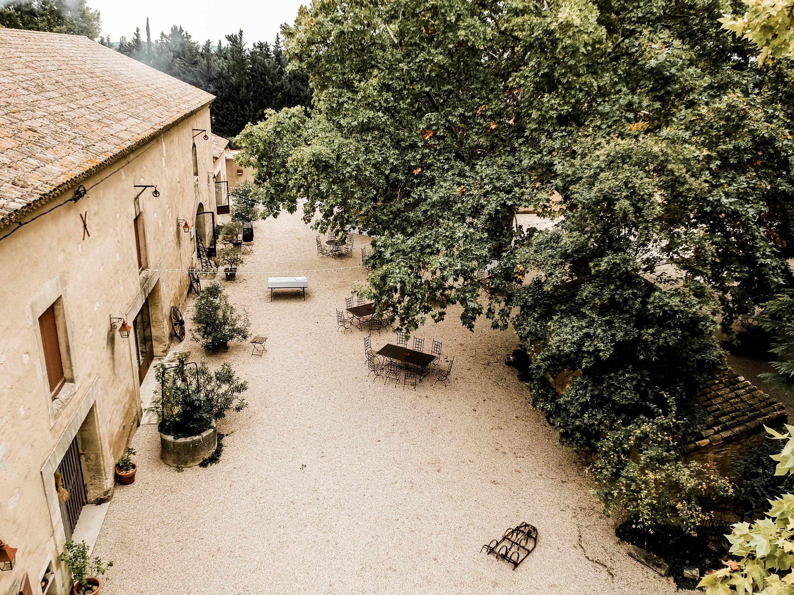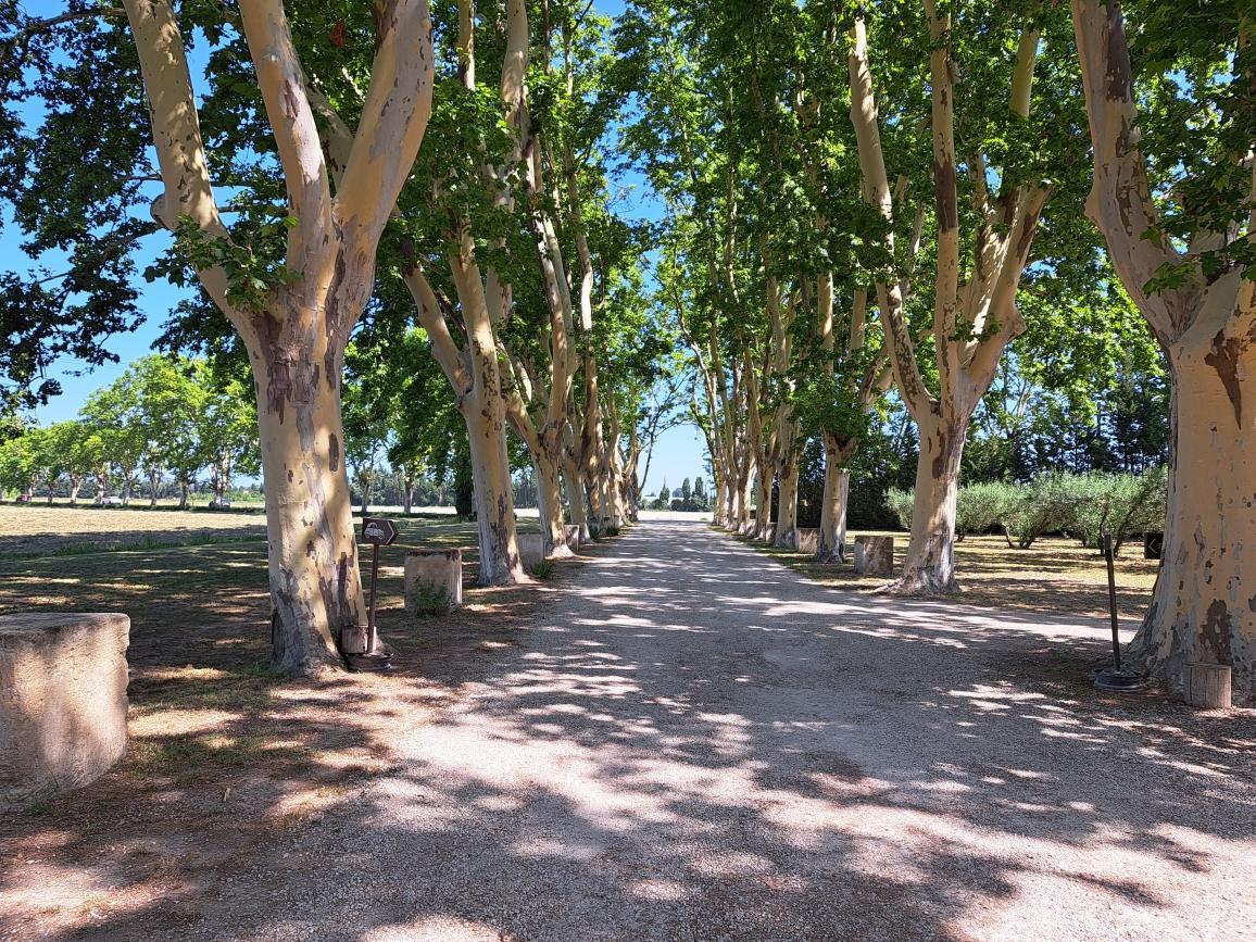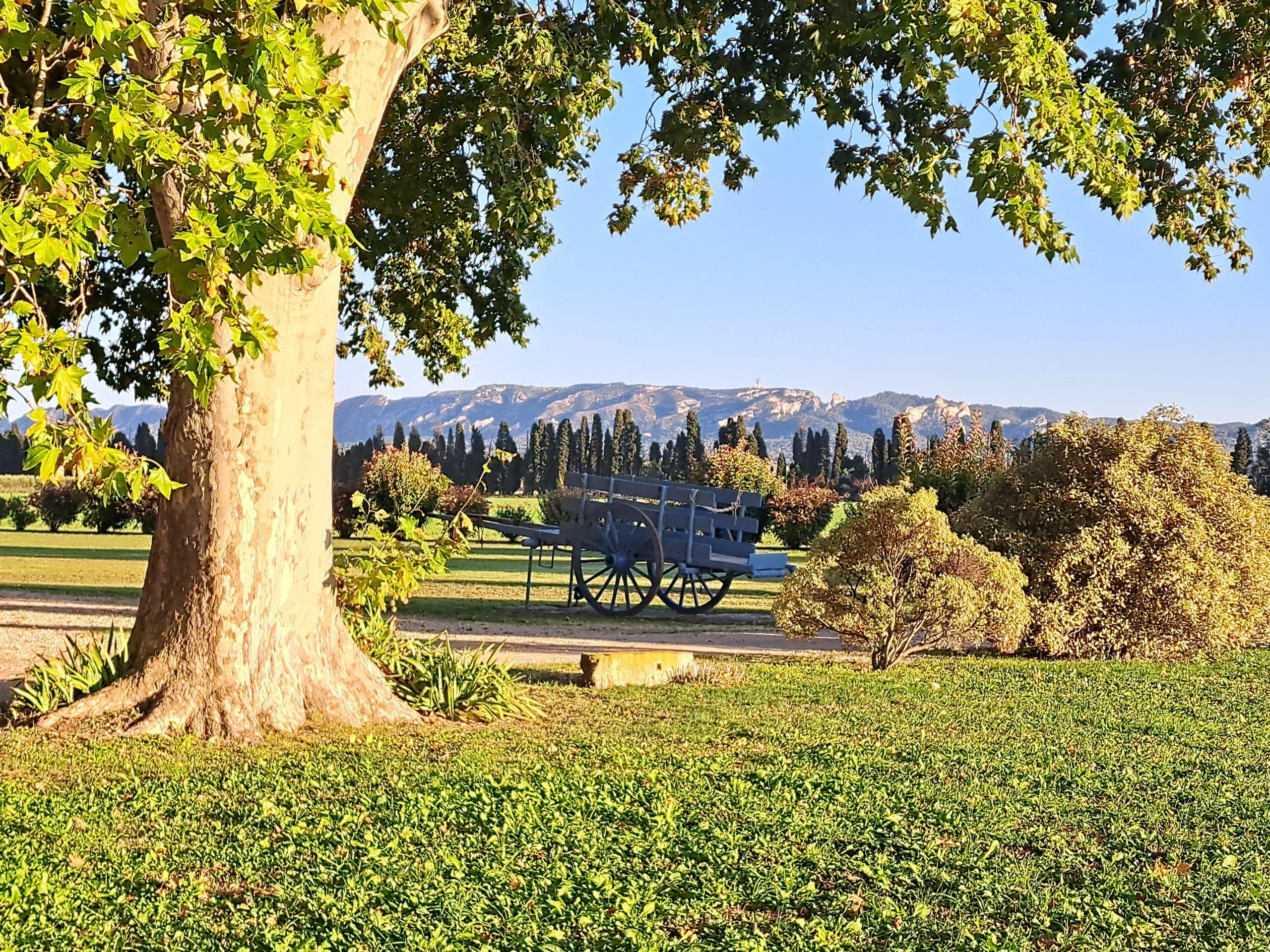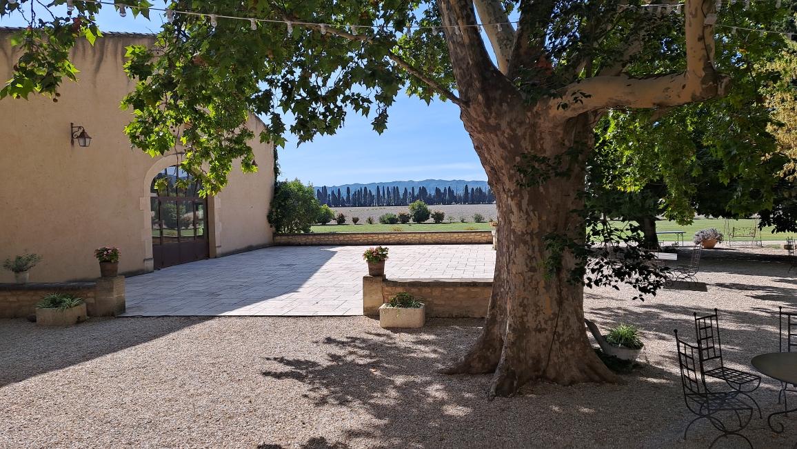 Une allée de platanes longeant une oliveraie, une cour arborée et généreusement ombragée, une terrasse offrant une vue panoramique sur les Alpilles, tel est le cadre de vie actuel du Mas du Juge.